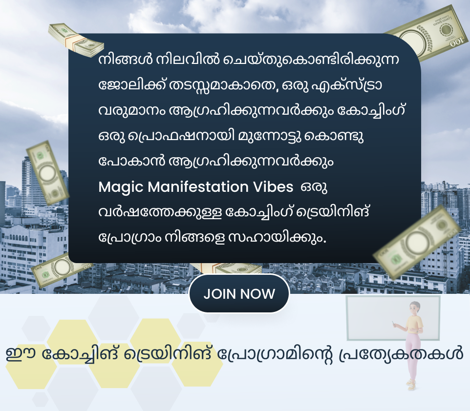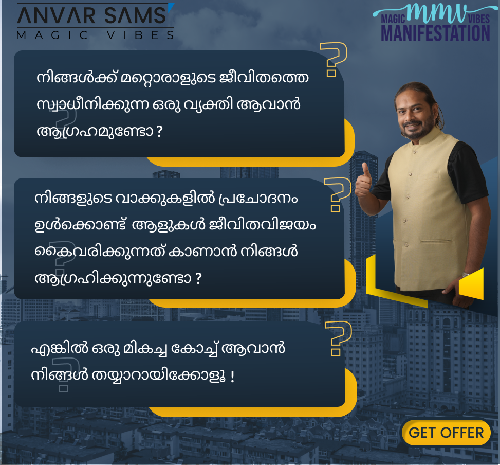 ജീവിതത്തില് യഥാര്ത്ഥ സന്തോഷവും സമാധാനവും എങ്ങനെ നേടാം? ഈ വലിയ ചോദ്യത്തിനുള്ള ലളിതവും ശക്തവുമായ ഉത്തരത്തിലേക്കാണ് 'മാജിക് മാനിഫെസ്റ്റേഷന് വൈബ്സ്' നിങ്ങളെ കൊണ്ടുപോകുന്നത്. നമ്മുടെ ജീവിതത്തിലെ ഒമ്പത് മേഖലകളിലെ ലക്ഷ്യങ്ങള് സാക്ഷാല്ക്കരിക്കപ്പെടുമ്പോഴാണ് യഥാര്ത്ഥ ജീവിതവിജയമുണ്ടാകുന്നത്. ഇതില് ഏതെങ്കിലും മേഖലകളിലെ ലക്ഷ്യങ്ങള് സാക്ഷാല്ക്കരിക്കപ്പെടാതെ കിടക്കുന്നതാണ് ഇന്ന് നാം അനുഭവിക്കുന്ന പല യാതനകള്ക്കും കാരണം.